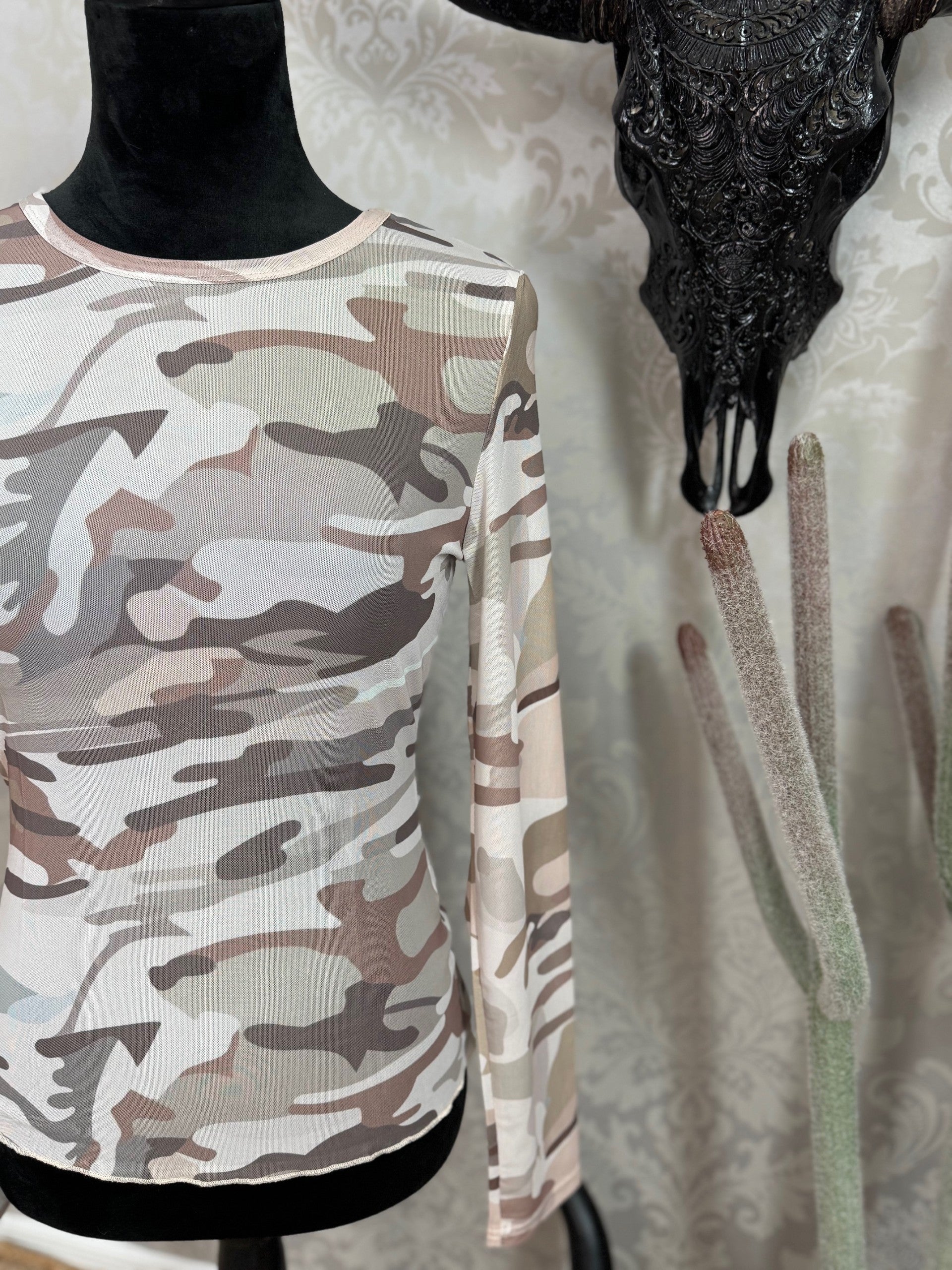 Make a bold yet effortless statement with this sleek neutral camo mesh. Designed with a soft, lightweight stretch mesh that hugs your curves in all the right places, this piece blends edgy street style with chic minimalism. The muted beige, tan, and taupe camouflage tones create a modern, elevated take on a classic print—perfect for layering or wearing solo for a confident look.