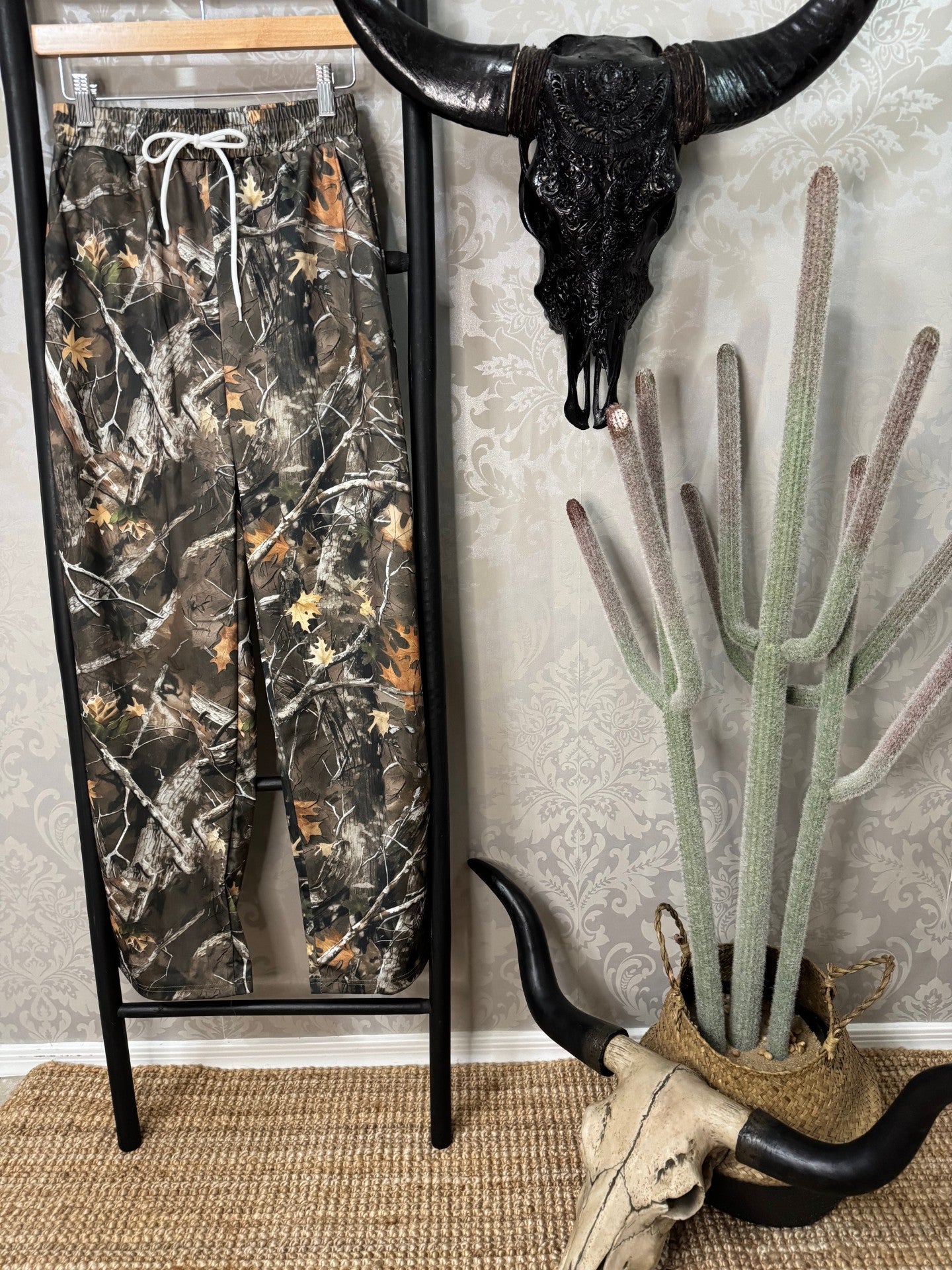 Stay comfy and on-trend in these Woodland Camo pants, the perfect blend of rugged and relaxed. Featuring an earthy camouflage print with autumn leaf accents, these pants bring an outdoorsy edge to any look. Designed with an elastic waistband and adjustable drawstring for an effortless fit that moves with you.